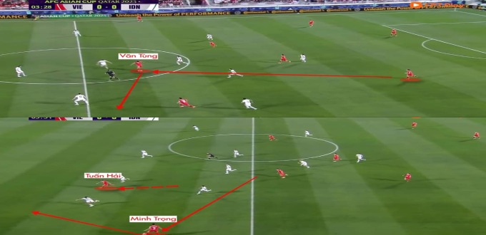 Khi chúng ta tấn công, hàng tiền vệ chơi thấp dâng lên khá chậm dẫn đến chúng ta thiếu người phối hợp, dẫn đến các miếng đánh đơn lẻ và thiếu nhịp nhàng. Đồ hoạ: Phương Đường Kính