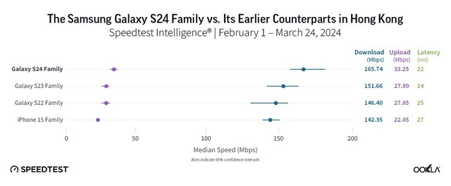 Ookla đã chia sẻ kết quả kiểm tra mới nhất trong một bài đăng trên blog. Công ty đã thu thập dữ liệu từ ngày 1/2 đến ngày 24/3 trên khắp Châu Á Thái Bình Dương, Trung Đông và Châu Phi, Châu Âu và Bắc Mỹ, so sánh dòng Galaxy S24, Galaxy S23 và Galaxy S22 với iPhone 15.