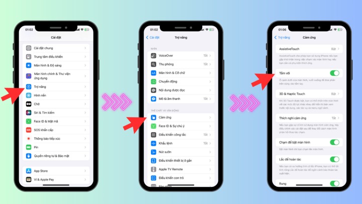 Để tắt, bạn hãy mở Cài đặt và truy cập vào Trợ năng > Cảm ứng sau đó, gạt sang OFF ở dòng "Tầm với".