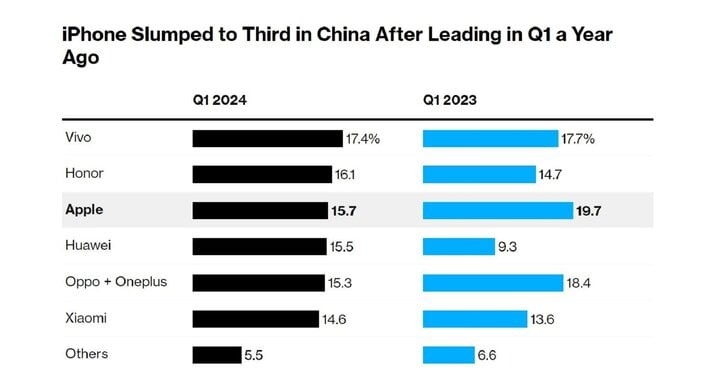 iPhone tụt xuống vị trí thứ 3 tại Trung Quốc trong quý 1 năm 2024 sau khi dẫn đầu trong cùng kỳ năm trước. (Ảnh: Counterpoint Research)