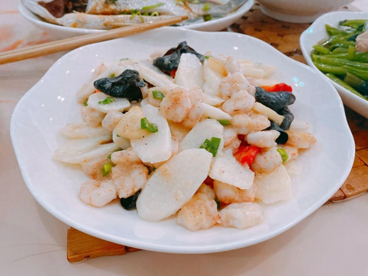 Nguyên liệu: 1 củ mài, 200 gram tôm, mộc nhĩ, ớt đỏ, gừng thái sợi, tỏi cắt lát, hành lá cắt nhỏ. Gia vị: muối, tiêu, rượu nấu ăn, bột nêm, dầu ăn.