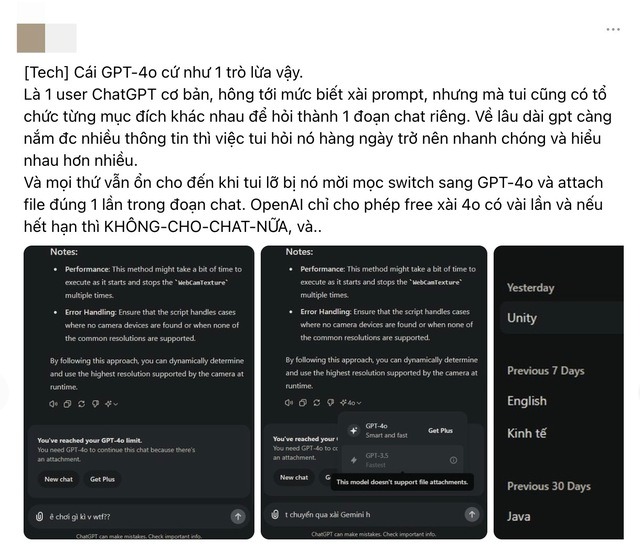 Tuy nhiên, người dùng đã nhanh chóng bày tỏ sự thất vọng với bản cập nhật mới. Một bài đăng trên mạng xã hội Threads đã nêu rõ một bất cập của GPT-4o, đặc biệt là với người dùng miễn phí.