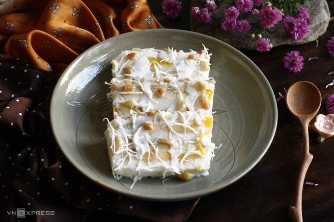 Xếp bên dưới một lớp dừa nạo và lạc rang giã dập rồi tới lớp chuối, mít rồi chan một lớp hỗn hợp kem. Làm lần lượt cho tới hết nguyên liệu. Trên cùng phủ lớp dừa nạo và lạc rang, lắc nhẹ hộp hoặc dùng tay ấn nhẹ để các lớp dính vào nhau.