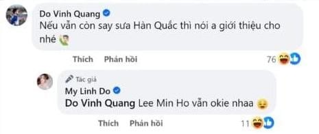 Chủ tịch CLB Hà Nội Đỗ Vinh Quang - ông xã của cô lập tức phản hồi khi thấy bà xã hoa hậu nhắc đến trai đẹp: "Nếu vẫn còn say sưa Hàn Quắc (Hàn Quốc - PV) thì nói anh giới thiệu cho nhé". Về phía Đỗ Mỹ Linh, cô nàng cũng phản hồi chồng bằng lời khẳng định: "Lee Min Ho vẫn ok nha".