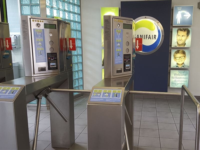 Kate Storm, một blogger du lịch ở New York, người chuyên đưa tin về văn hóa nhà vệ sinh trên trang web Our Escape Clause của mình cho biết, “ Châu Âu có nhiều nhà vệ sinh công cộng hơn ở Mỹ, nhưng bạn thường phải trả tiền khi sử dụng. ”Khoản tiền này thường là một khoản tiền lẻ nhỏ: 50 xu hoặc 1 euro ở các quốc gia thuộc Liên minh Châu Âu, 1 hoặc 2 franc Thụy Sĩ hoặc 1 bảng Anh ở Vương quốc Anh, dùng để trả cho người dọn dẹp và giúp trang trải chi phí bảo trì, vật tư và nhân công. Với những nhà vệ sinh có thêm tiện nghi như phòng thay đồ, khoản tiền này có thể cao hơn. Nhiều điểm đến ở châu Âu đang hướng tới nền kinh tế không tiền mặt, nên ngày càng có nhiều nhà vệ sinh chấp nhận thanh toán bằng thẻ tín dụng.