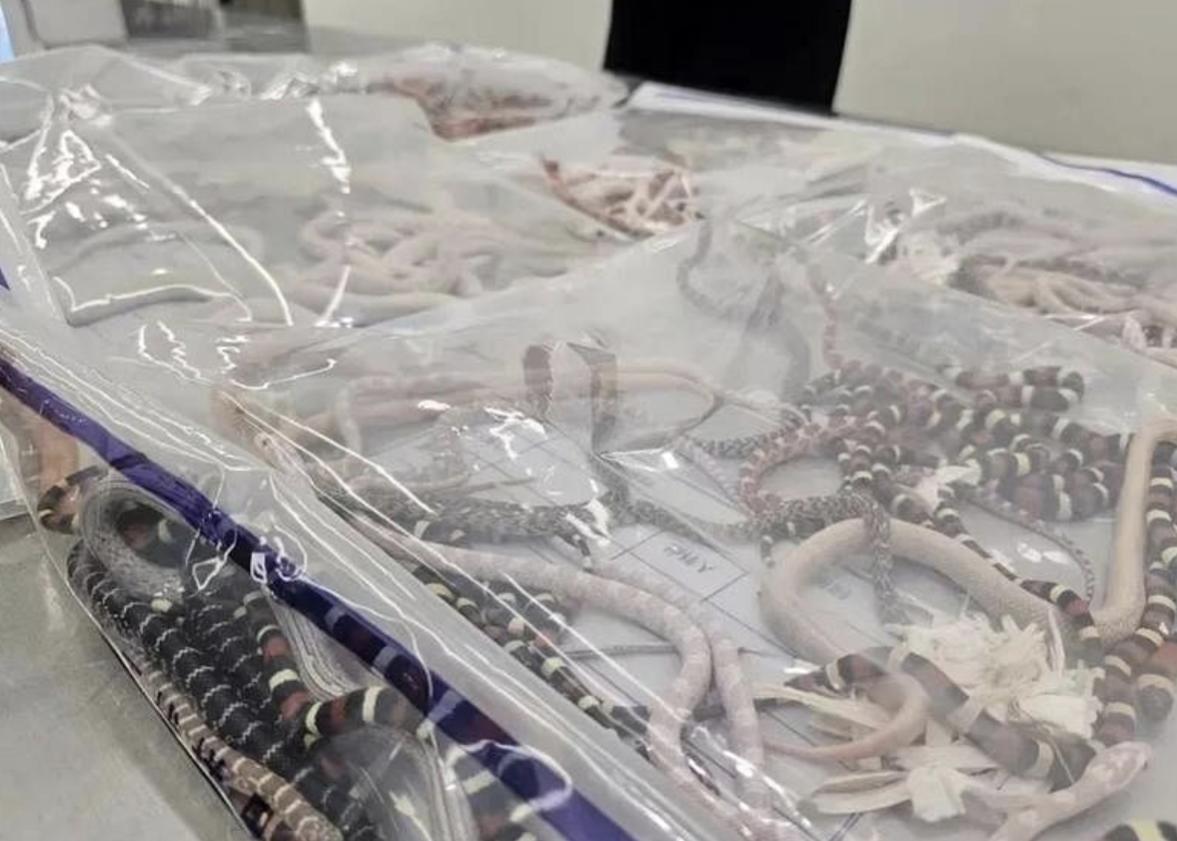 Cơ quan chức năng sau đó đã thu giữ 104 động vật bò sát có vảy bao gồm rắn sữa, rắn ngô và có nhiều loài không phải rắn bản địa. Một đoạn video kèm theo cho thấy hai nhân viên hải quan đang quan sát những túi nhựa trong suốt chứa nhiều loài rắn với màu đỏ, hồng, trắng... đang chuyển động.