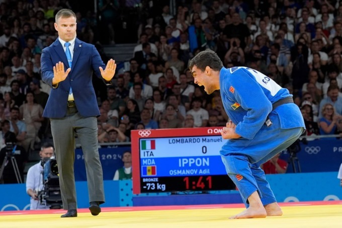 Võ sĩ Moldova Adil Osmanov chấn thương vì một khoảnh khắc phấn khích, sau khi thắng Manuel Lombardo ở trận tranh HC đồng 73kg judo nam Olympic Paris 2024 ngày 30/7.