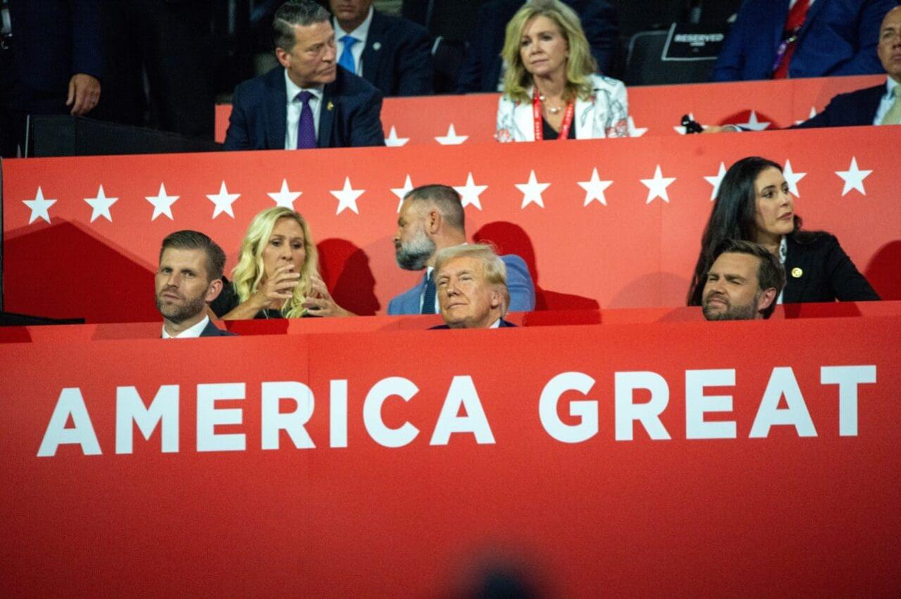 Cựu Tổng thống Hoa Kỳ Donald Trump tham dự Đại Hội Toàn Quốc Của Đảng Cộng Hòa (RNC) tại Diễn đàn Fiserv ở Milwaukee, Wisconsin, hôm 16 tháng Bảy 2024. Cựu Tổng thống Donald Trump đã chọn JD Vance làm người đồng hành cùng ông, nâng cao tấm vé tổng thống của Đảng Cộng Hòa. (Hình: Jacek Boczarski/Anadolu via Getty Images)