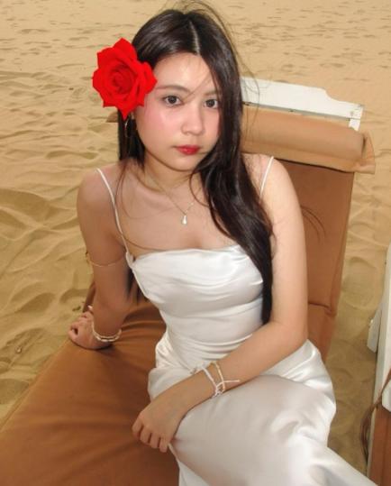 Cô nàng diện chiếc váy lụa màu trắng, khoe trọn đường cong cơ thể, kết hợp cùng bông hoa hồng cài lên tóc làm điểm nhấn.