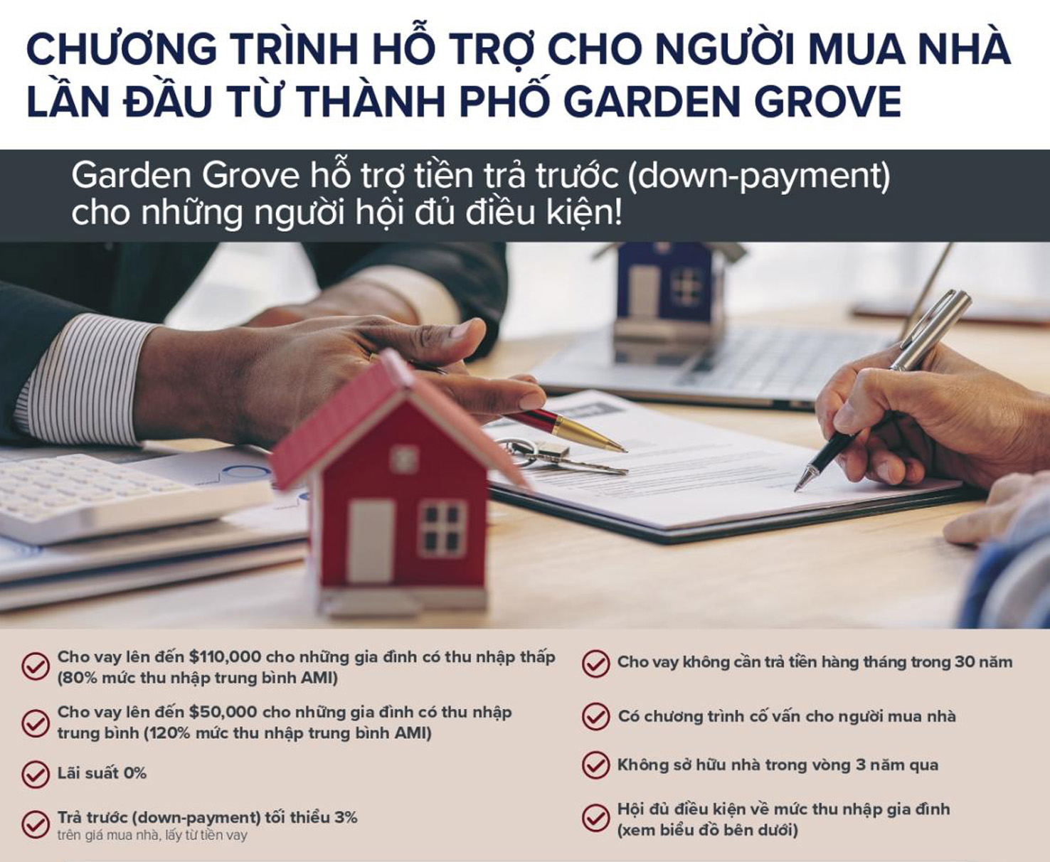 Chương trình “Hỗ Trợ Người Mua Nhà Lần Đầu” của Garden Grove là một phần trong chương trình CalHome của tiểu bang California, chương trình cho vay trả góp 30 năm không cần trả tiền hằng tháng.