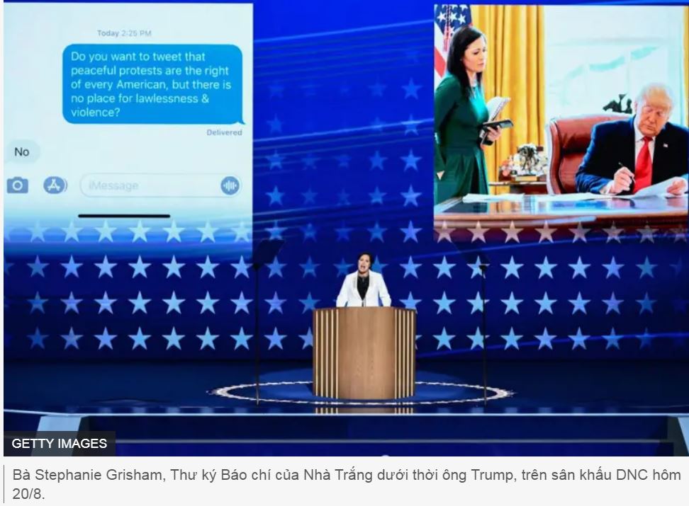 Chụp lại hình ảnh,Bà Stephanie Grisham, Thư ký Báo chí của Nhà Trắng dưới thời ông Trump, trên sân khấu DNC hôm 20/8.