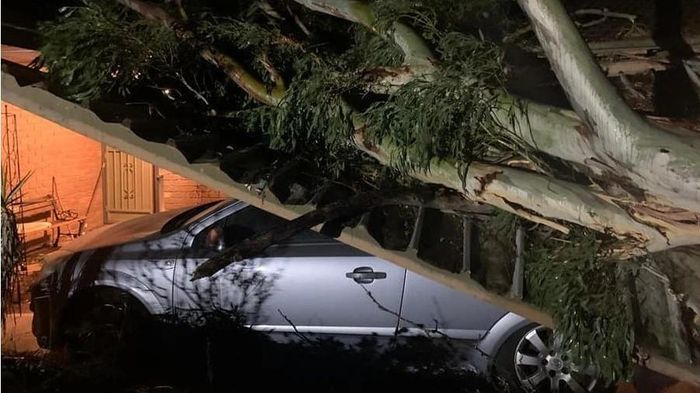 Gió to làm cây đổ vào xe ô tô ở trong một bãi đỗ xe tại bang Victoria. Nguồn FB