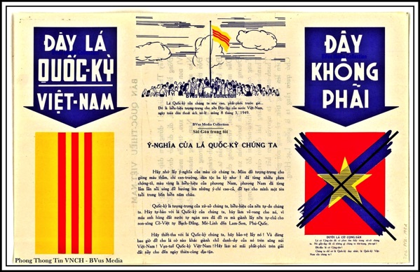 Hình ảnh Lá Cớ Tổ Quốc Việt Nam Vàng Ba Sọc Đỏ trên poster của Phòng Thông Tin VNCH phát hành trong giai đoạn 1950-1955, nêu rõ ý nghĩa thiêng liêng của lá Quốc Kỳ chính thức của Quốc Gia Việt Nam đã có từ xa xưa chứ không như lá cờ đỏ của tỉnh Phúc Kiến do bọn cộng sản Trung Quốc chỉ thị cho bọn tay sai đàn em mang về áp đặt lên đất nước Việt Nam và lừa bịp người dân gọi đó là cờ tổ quốc.