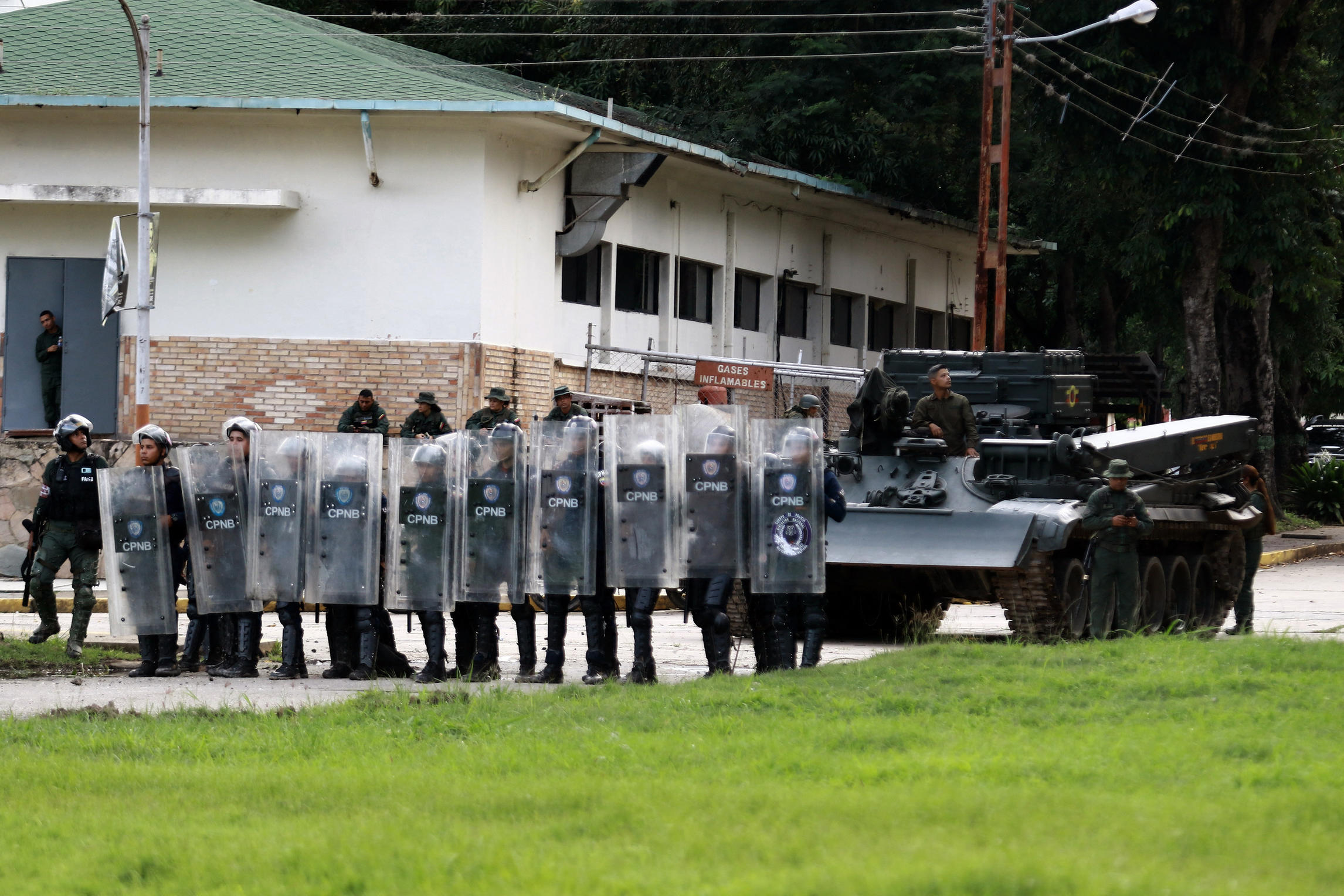Cảnh sát Venezuela với trang bị chống bạo động và thiết giáp lập chốt gác tại bang Carabobo vào ngày 29/7. Ảnh: AFP