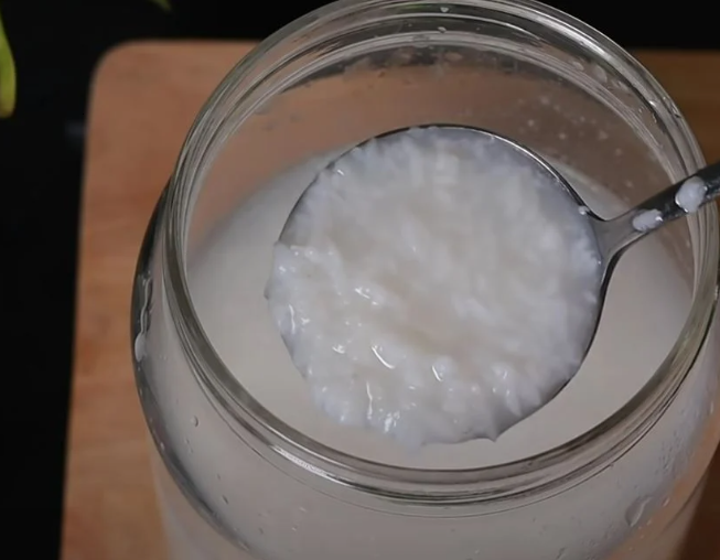 Khi nước sôi, hạt gạo nở trong, bạn hãy chắt lấy phần nước cơm và để cơm tiếp tục được nấu chín. Phần nước cơm cũng để nguội hoàn toàn.