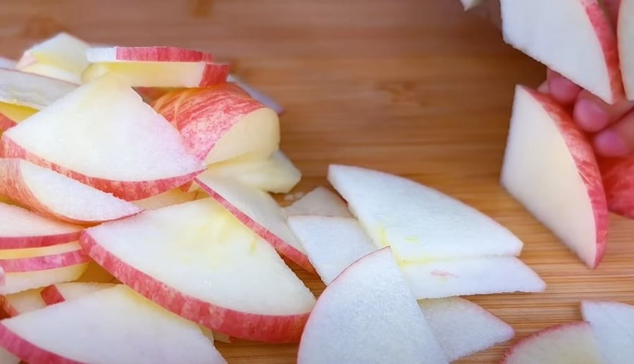Cắt táo thành miếng vừa, bỏ phần cuống và hạt. Táo cắt đến đâu ngâm vào tô nước đá lạnh đến đó để táo không bị thâm. Sau đó, vớt táo ra để ráo nước.