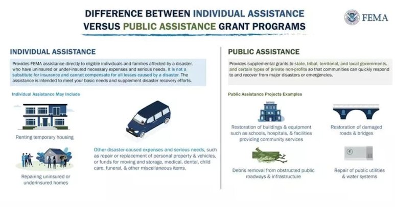 In addition to individual assistance, FEMA has public assistance programs that support the community as a whole. A graphic included in a FEMA post on X on October 2, 2024, spelled out the available government support: