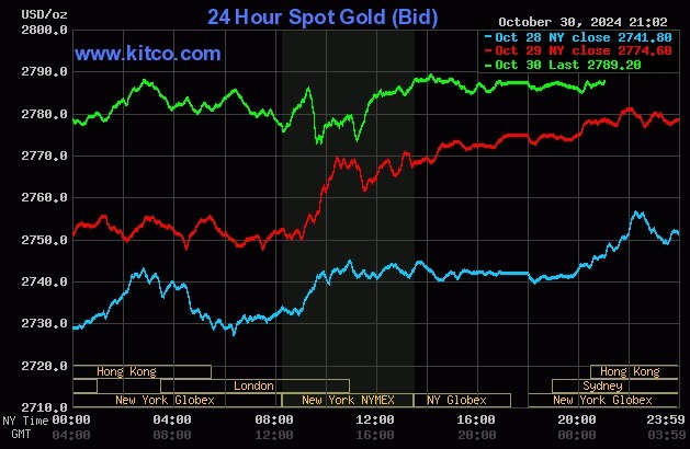Chốt phiên giao dịch 30/10, giá vàng thế giới giao ngay tăng 12 USD lên 2.787 USD một ounce. Đây là mức đóng cửa cao kỷ lục mới của kim loại quý. Trong phiên, giá còn có thời điểm chạm 2.789 USD.