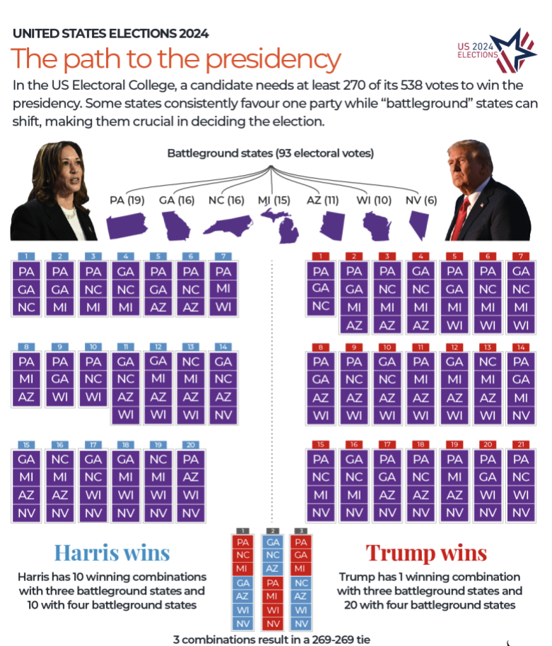Tổng số phiếu ở 7 bang chiến trường là 93, trong đó bà Kamala cần 44 phiếu và ông Trump cần 51 phiếu để thắng cử.
