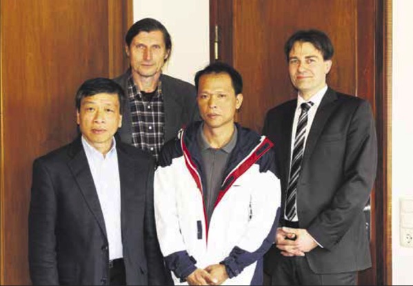 Thị trưởng TP. Weimar ông Peter Kleine (bên phải), nhà điêu khắc Walter Sachs (bên trái) thuộc Hội “Thành phố Weimar – nơi nương tựa” và Vũ Quốc Dũng (phía trước bên trái) thuộc Tổ chức Nhân quyền Quốc tế (IGFM) tiếp đón nhà văn Bùi Thanh Hiếu tại cơ quan chính quyền thành phố.