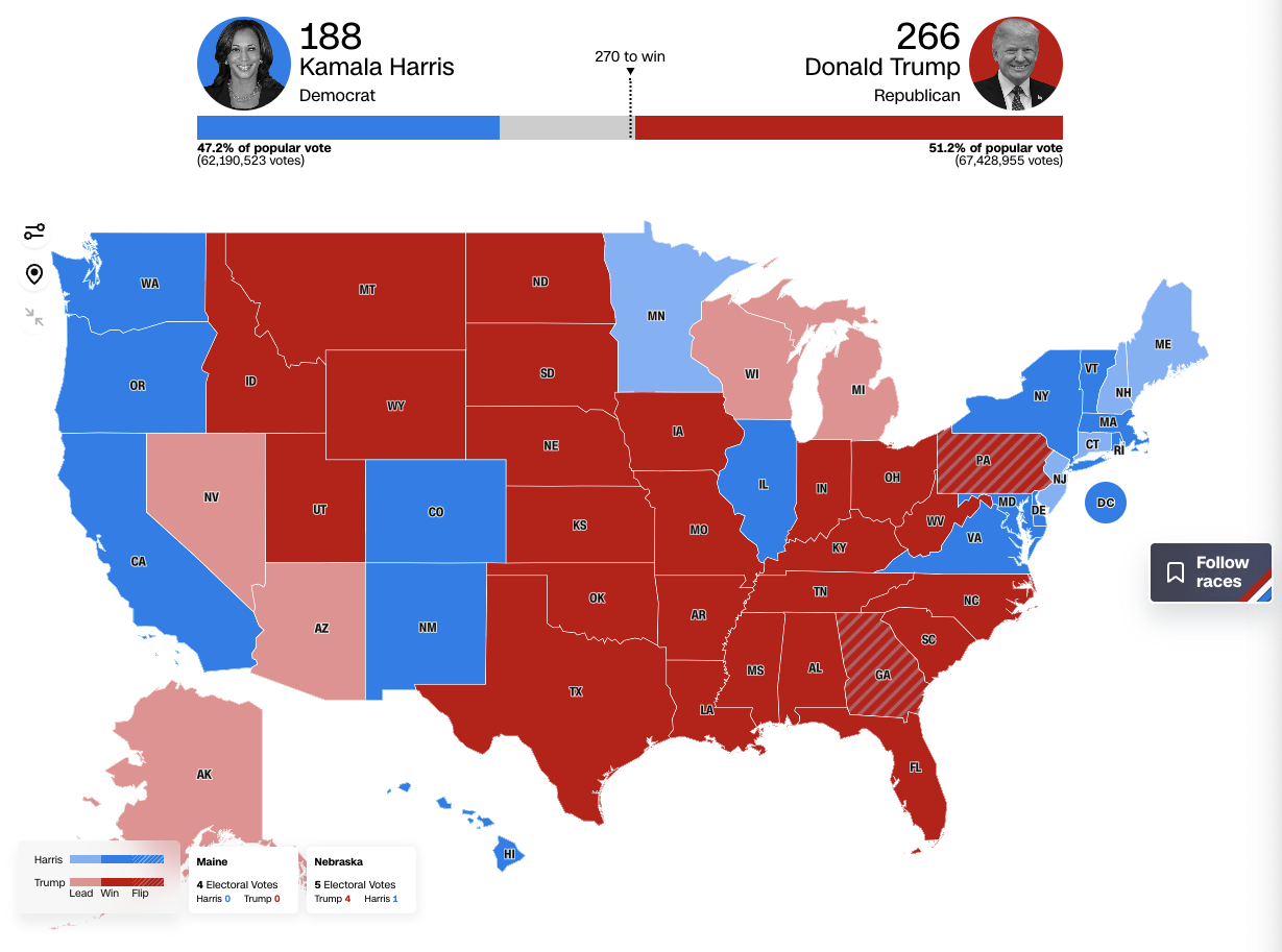 Với tỷ lệ đếm phiếu tới 95%, ông Trump đang dẫn khá cao trước Kamala Harris. Khả năng bà Harris khó có thể đảo ngược tình thế. Như vậy ông đã đạt được 266 phiếu, chỉ cần thêm 4 phiếu nữa là thắng cử, khả năng lớn nếu thắng ở Arizona, Alaska nữa thì gần như 100% ông Trump đắc cử nơi mà hiện đang dẫn cũng khá cao.