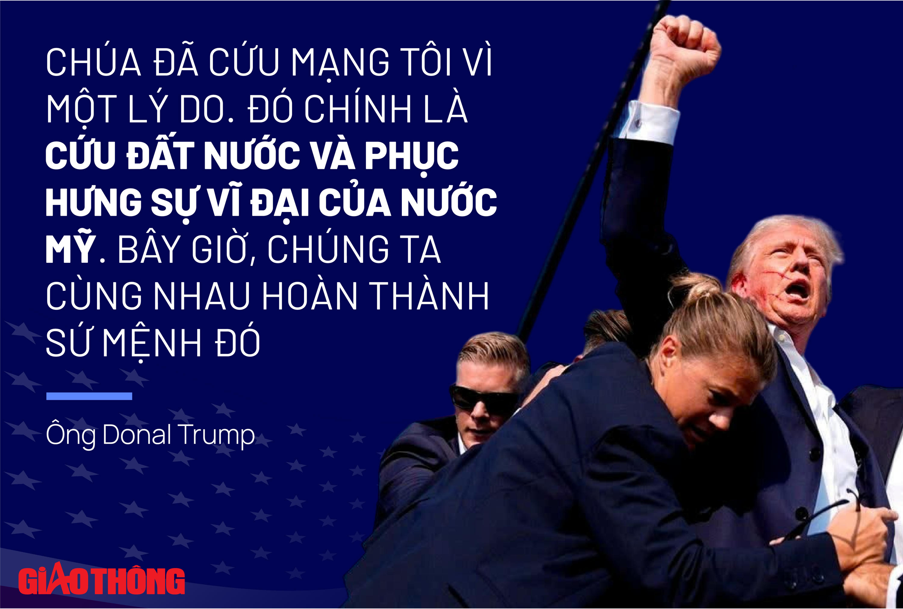 Đây là chia sẻ của ông Donald Trump trong bài phát biểu tại buổi lễ theo dõi kết quả bầu cử tối 5/11, ngay sau khi hàng loạt kênh truyền thông của Mỹ đưa tin cựu lãnh đạo Nhà Trắng đắc cử Tổng thống. Câu nói "Chúa đã cứu mạng tôi" ám chỉ việc ông từng nhiều lần là mục tiêu bị ám sát, trong đó có 2 lần bị ám sát hụt. Lần ám sát đầu tiên và nghiêm trọng nhất xảy ra khi ông đang vận động tranh cử ở bang Pennsylvania ngày 13/7. Một phát súng hướng về ông Trump nhưng đạn sượt qua tai và nhà cựu lãnh đạo Mỹ thoát chết trong gang tấc. Kẻ ám sát bị tiêu diệt, đến nay, vẫn chưa rõ động cơ của người này. Hình ảnh ông Trump với khuôn mặt chảy máu, vươn nắm đấm lên trời thể hiện sự quyết tâm mạnh mẽ đã giúp ông thu hút ngày càng nhiều cử tri ủng hộ.