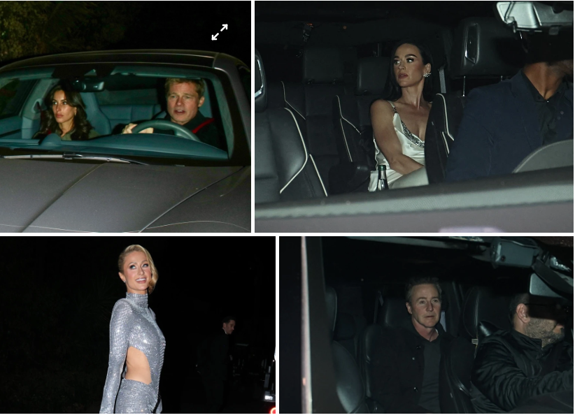 Perry diện váy lụa, trò chuyện rôm rả với chồng trước khi xuống xe. Trong khi đó, "nữ hoàng tiệc tùng" Paris Hilton mặc váy ánh bạc cut-out khoe vòng eo, phối phụ kiện matching trang phục.