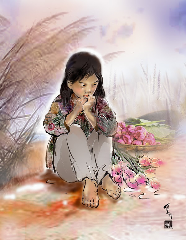 “Tôi cũng lội ao hái sen đi bán, có khi giăng lưới đánh cá, làm đủ kiểu để kiếm miếng ăn, con bé Thanh ngày đó ngồi trên bờ nh́n cha nó lội ao, lội đầm, nhiều lần cũng bảo: “Cho con đi với!” nhưng tôi cản. Hơn một năm trước, không hiểu bệnh ǵ mà bỗng dưng tôi mệt trong người, rồi chân th́ yếu dần, đứng không vững chứ nói ǵ đến lội ao. Rồi Hồng Thanh thay tôi làm việc, nó bảo cha lội được, con cũng lội được. Giờ ngày nào, nó cũng ra đó hái sen rồi đạp xe ra đường nhựa, ngồi bán đến hết mới về…”