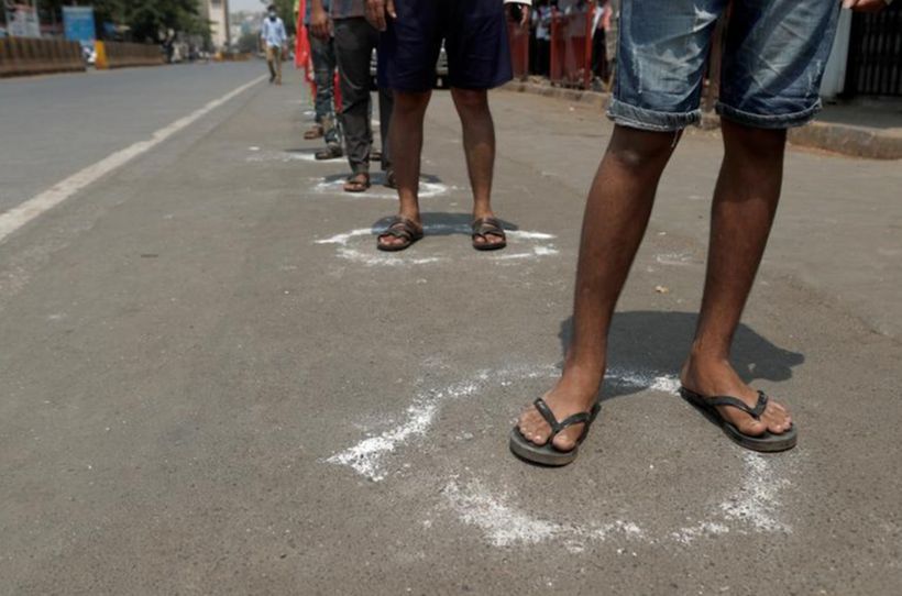 Xếp hàng theo những vòng tròn được vẽ bằng phấn, để duy trì khoảng cách an toàn, khi chờ được vô một siêu thị ở Mumbai, Ấn Độ (Francis Mascarenhas, Reuters).