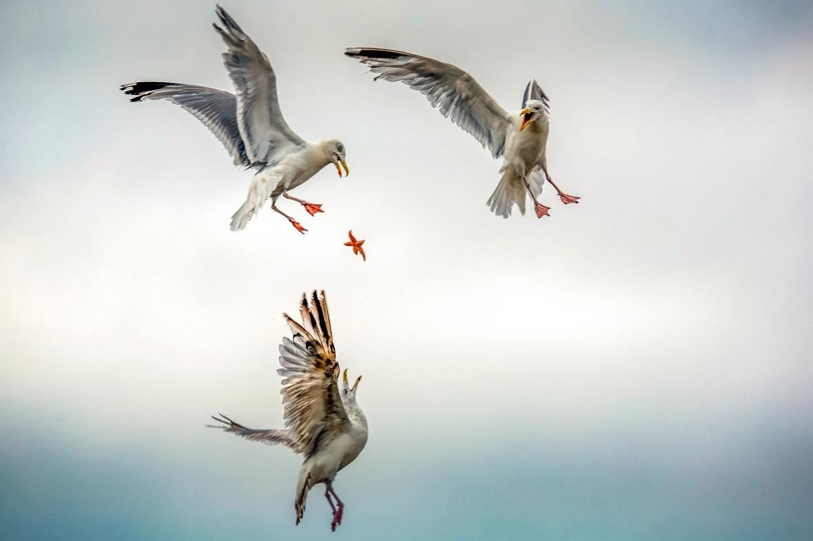 Những con chim mòng biển tranh sao biển lúc triều dâng tại bãi biển La Baule, Pháp. Bức ảnh của tác giả người Pháp Caroline Paux ..Giải của Sony.