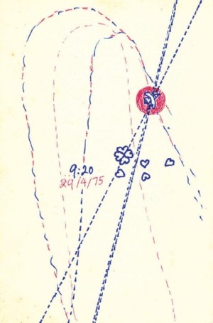 Bức thứ nhất có rất nhiều hình của một con chim nhỏ đang bay tá lả, có chỗ chim đang ẩn mình trong một cái bầu kín, có chỗ lại núp trong một cái bầu chỉ kín có phân nửa, cùng với một số hoa tim bốn cánh nằm rải rác trên cái nền chằng chịt những con đường đứt quãng. Có những vật tròn nhỏ tô đậm, có cái còn nguyên, có cái nổ tung như một trái bom. Dưới bức vẽ có đề hàng chữ Saigon S. Việt Nam WHERE ARE YOU NOW, LOVE? 9:10pm- 29/4/‘75.