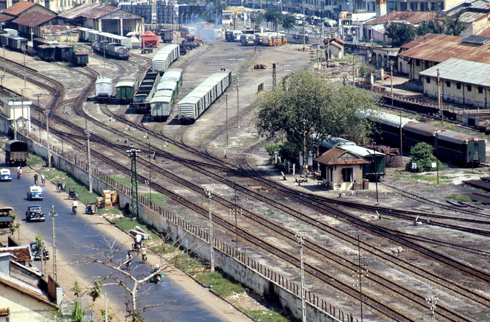 Ga xe lửa Bến Thành – Saiogn năm 1964-1965, nay trở thành công viên 23-9. Góc hình được nhìn từ đường Lê Lai về phía Trần Hưng Đạo. Ở góc trên trái nhìn thấy một chút mặt đứng của tòa nhà Hỏa Xa Đông Dương phía sau các mái nhà tôn.