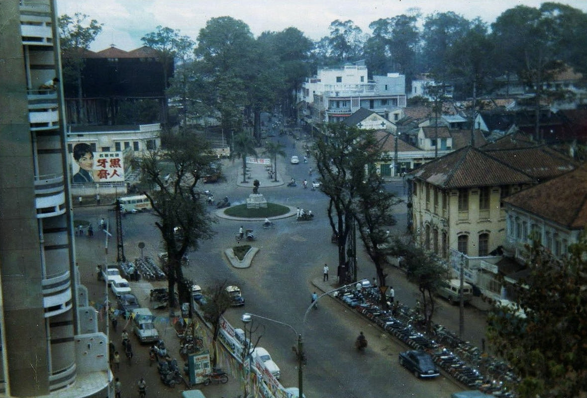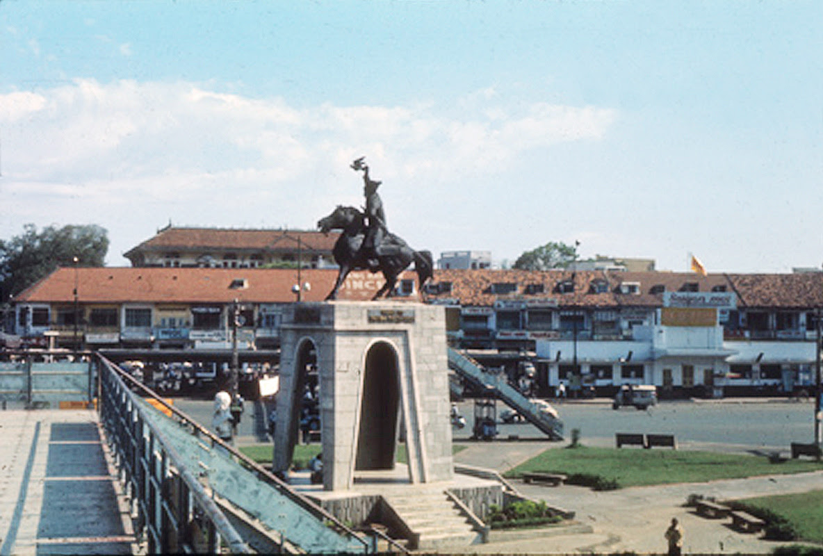 Saigon 1971 – Tượng đài Trần Nguyên Hãn nhìn từ trên cầu vượt dành cho khách bộ hành. Phía sau tượng đài nhìn thấy phần chân của cầu vượt bộ hành thứ hai từ bùng binh nối qua bến xe buýt. Nhà có mái ngói cao nhất trong hình là Nhà chú Hỏa, trên đường Phó Đức Chính.