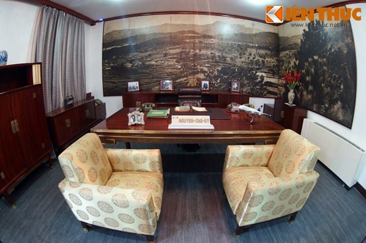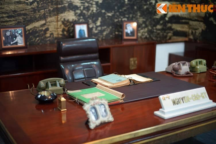 Bên phải căn phòng là nơi làm việc của ông Nguyễn Cao Kỳ với chiếc bàn làm việc khá lớn. Sau chiếc bàn là bức ảnh “Cao nguyên trung phần” (Tây Nguyên) của nhiếp ảnh gia Nguyễn Cao Đàm được in khổ lớn ốp lên tường.