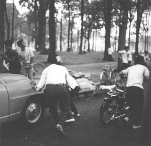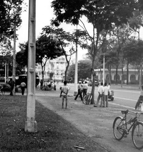 Cảnh tượng hoảng loạn ở đường Thống Nhất (nay là đường Lê Duẩn), trước cổng Dinh, khi vụ tấn công xảy ra. Theo công bố của giới chức, hai phi công thực hiện vụ ném bom Dinh Độc Lập là Nguyễn Văn Cử và Phạm Phú Quốc, đều phục vụ trong không quân Sài Gòn. Ảnh: Vietnam Center and Archive.