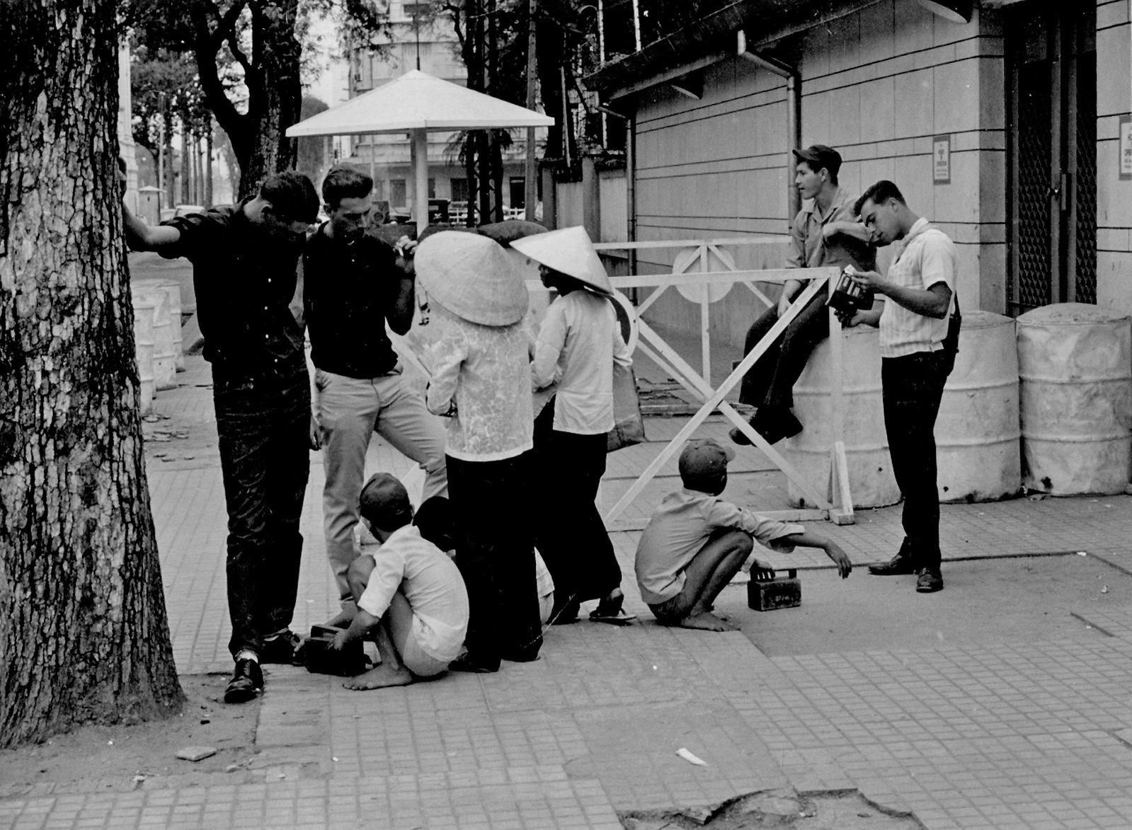 Trên vỉa hề phía Khách sạn Brinks – Phía xa là tòa nhà thương xá EDEN với tiệm café Givral ở góc tầng trệt.