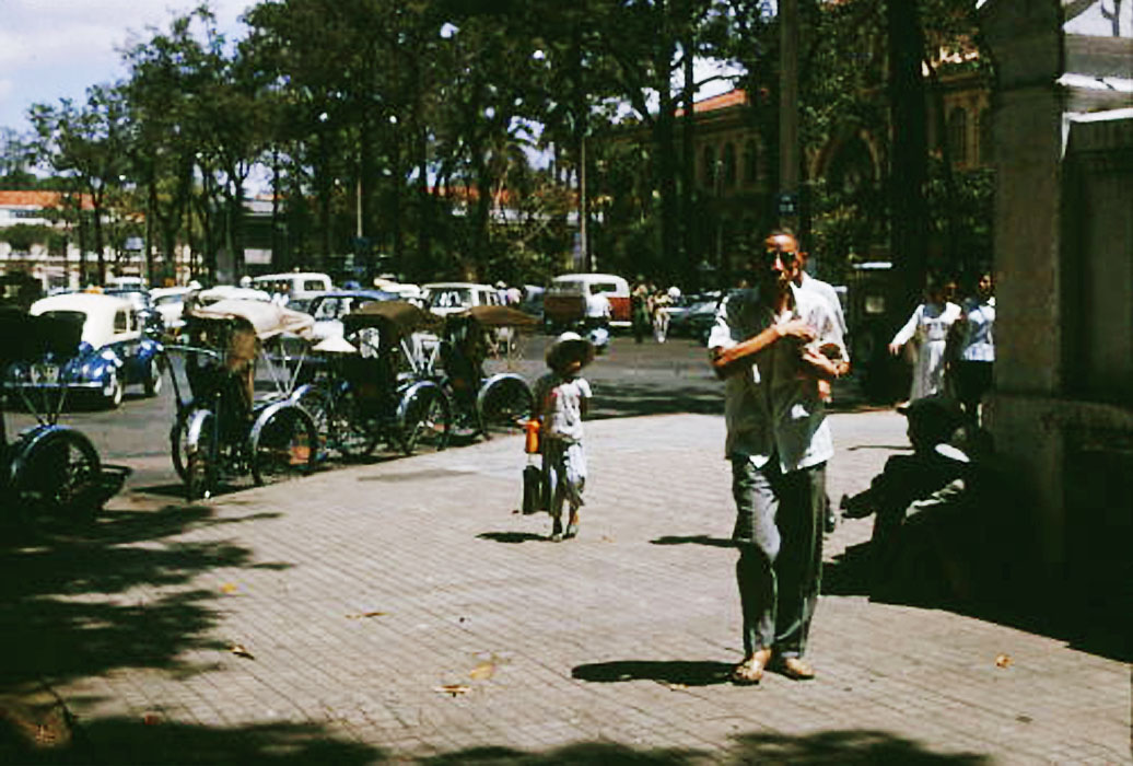 Xe bò bía phía trước bưu điện. Khi đó Sài Gòn không đâu nhiều xe bò bía đứng như ở bưu điện. Do cạnh тʀᴀɴн nhau rất là gắt nên giá cũng rất là rẻ, có тнể ăи chục cái một lúc không sợ lủng túi. Đó cũng là tại sao trong hình một đống được cuộn sẵn vì hiếm khi ai mua một hai cái. Bò bía xưa so với bánh tráng trộn bây giờ phải nói không đẹp mắt bằng, nhưng chắn chắn không sợ ăи phải nhựa cao su dẻo hay dầu ăи thải tái chế.