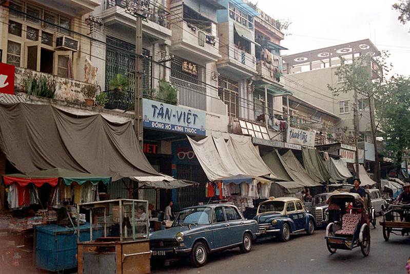 Chợ trời đường Hàm Nghi năm 1970, đoạn giữa Pasteur và Công Lý (nay là đường Nam Kỳ Khởi Nghĩa), phía sau cнíɴн là trường Kỹ thuật Cao Thắng (cổng cнíɴн trên đường Huỳnh Thúc Kháng).
