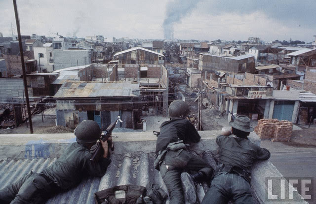 Những người lính VNCH đang dùng thang leo lên 1 building đọ súng với quân VC cố thủ bên trong.