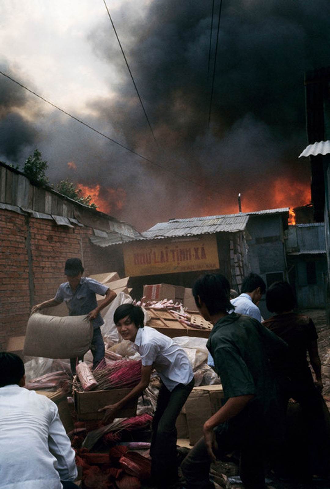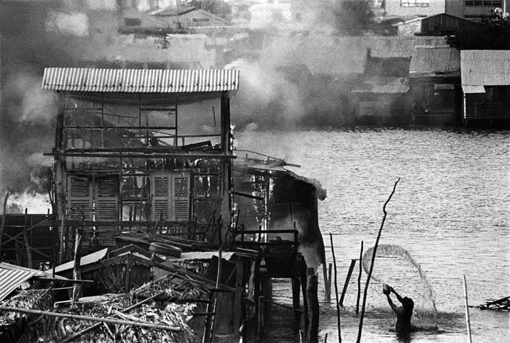 Một người dân hắt nước cứu ngôi nhà bốc cháy trên bờ sông ở Sài Gòn, 1968. Ảnh: Philip Jones Griffiths/Magnum.