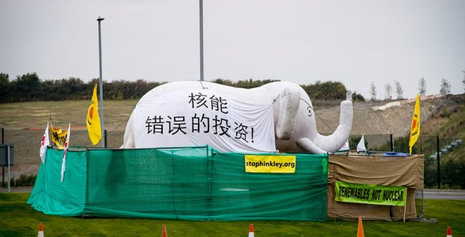 Một chú voi hình nộm do người biểu tình chống dự án hạt nhân Hinkley Point dựng lên tại Somerset (Anh), mang thông điệp gửi đến Chủ tịch Trung Quốc Tập Cận Bình, rằng đây có thể là một khoản đầu tư sai lầm.