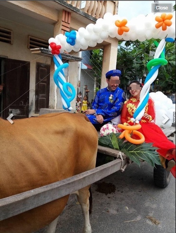 Nhưng điều đặc biệt và thu hút đông đảo sự chú ý của cộng đồng mạng có lẽ là chiếc xe hoa đón dâu của cặp đôi này. Nếu chỉ xem một số hình ảnh ban đầu trong lễ cưới thì nhiều người còn cho rằng chú rể sẽ tới đón cô dâu bằng chiếc xe ô tô “sang xịn”. Nhưng sự thật bất ngờ rằng cặp đôi này lại chọn một chiếc xe bò kéo làm xe hoa…