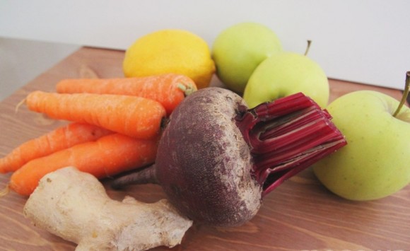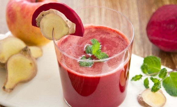 Củ dền, táo rửa sạch, gọt vỏ. Sau đó cho toàn bộ chúng vào máy xay sinh tố (máy ép) cùng với gừng và chanh, xay nhuyễn, lọc lấy nước mà uống. Lượng nước thu được, hãy tiêu thụ ngay sau đó.