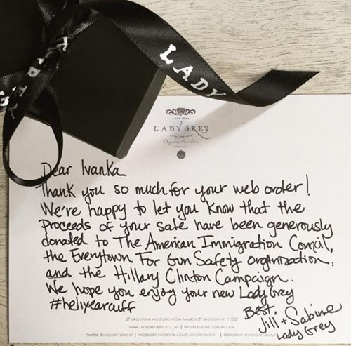 Tờ giấy viết: “Ivanka thân mến. Cám ơn bạn rất nhiều vì đã đặt mua hàng trên trang web của chúng tôi. Chúng tôi rất vui khi thông báo với bạn rằng doanh thu từ đơn hàng của bạn đã được quyên cho Hội đồng nhập cư Mỹ, Tổ chức sử dụng súng an toàn Everytown và Quỹ tranh cử Hillary Clinton. Chúng tôi hy vọng bạn sẽ yêu thích đôi hoa tai của Lady Grey.”