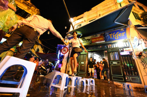 Khoảng 21h, trời đổ mưa lớn, kéo dài hơn một giờ đồng hồ. Các tuyến phố Tạ Hiện, Lương Ngọc Quyến, Mã Mây... tập trung nhiều hàng quán phục vụ đêm bị ngập nước cục bộ. Người dân dùng ghế nhựa thấp rải trên đường để đi lại.
