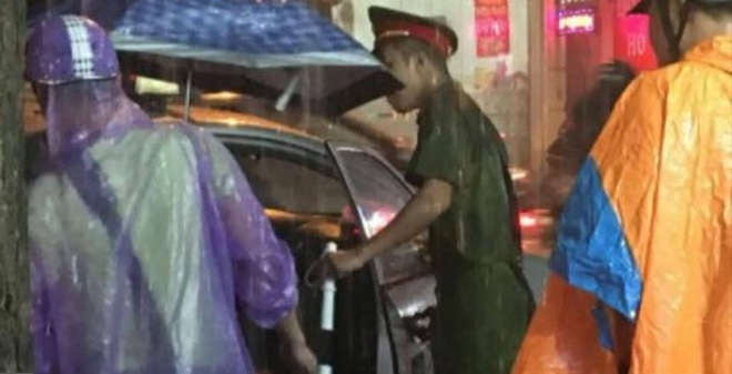 Trong bức ảnh, nhân vật chính là một chiến sĩ Công an đang đứng dầm mưa trước cửa xe taxi.