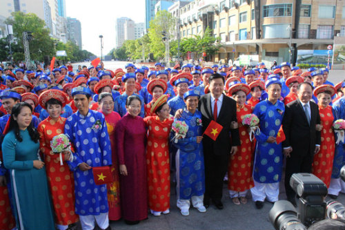 Nhân ngày 2/9, Bí thư Đinh La Thăng dẫn đầu đoàn đã đến chúc phúc cho các cặp đôi tham gia đám cưới tập thể tại Phố đi bộ Nguyễn Huệ.