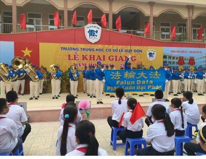 Cuối tiết mục, nhóm biểu diễn đã giăng một băng rôn vừa bằng tiếng Trung vừa bằng tiếng Việt. Trong đó, tiếng Việt ghi là “Pháp luân đại pháp”. Một phụ huynh của trường cho rằng: “Tiết mục văn nghệ như vậy không phù hợp với không khí, chủ đề của ngày lễ khai giảng”.Ông Nguyễn Văn Hiệp, Phó hiệu trưởng Trường THCS Lê Qúy Đôn thừa nhận, có tiết mục biểu diễn như trên trong chương trình. Ông Hiệp nói thêm: “Hiện trường đang viết tường trình và làm việc với các bên liên quan”.