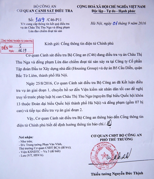 Ngày 25/8/2016, Cơ quan Cảnh sát điều tra Bộ Công an đã kết luận điều tra vụ án giai đoạn 1, chuyển hồ sơ đến Viện Kiểm sát nhân dân tối cao đề nghị truy tố trước pháp luật bị can Châu Thị Thu Nga (nguyên Đại biểu Quốc hội khóa 13 thuộc Đoàn đại biểu Quốc hội thành phố Hà Nội) và đồng phạm (gồm 7 bị can) và tiếp tục điều tra vụ án giai đoạn 2.