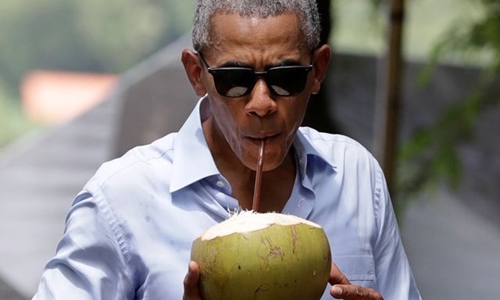 Tổng thống Mỹ Barack Obama uống nước dừa trong chuyến thăm Lào. Ảnh: AP